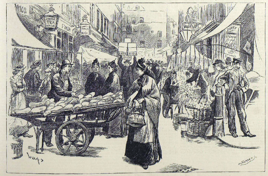 Clare Market was at the south-west corner of Lincoln’s Inn Fields, sold meat, fish and fresh vegetables against the backdrop of rows of slum housing. Dickens once described the area as marked by “houses of a poor description, swarming with inhabitants”. The entire quarter was knocked down and redeveloped at the start of the 20th century.