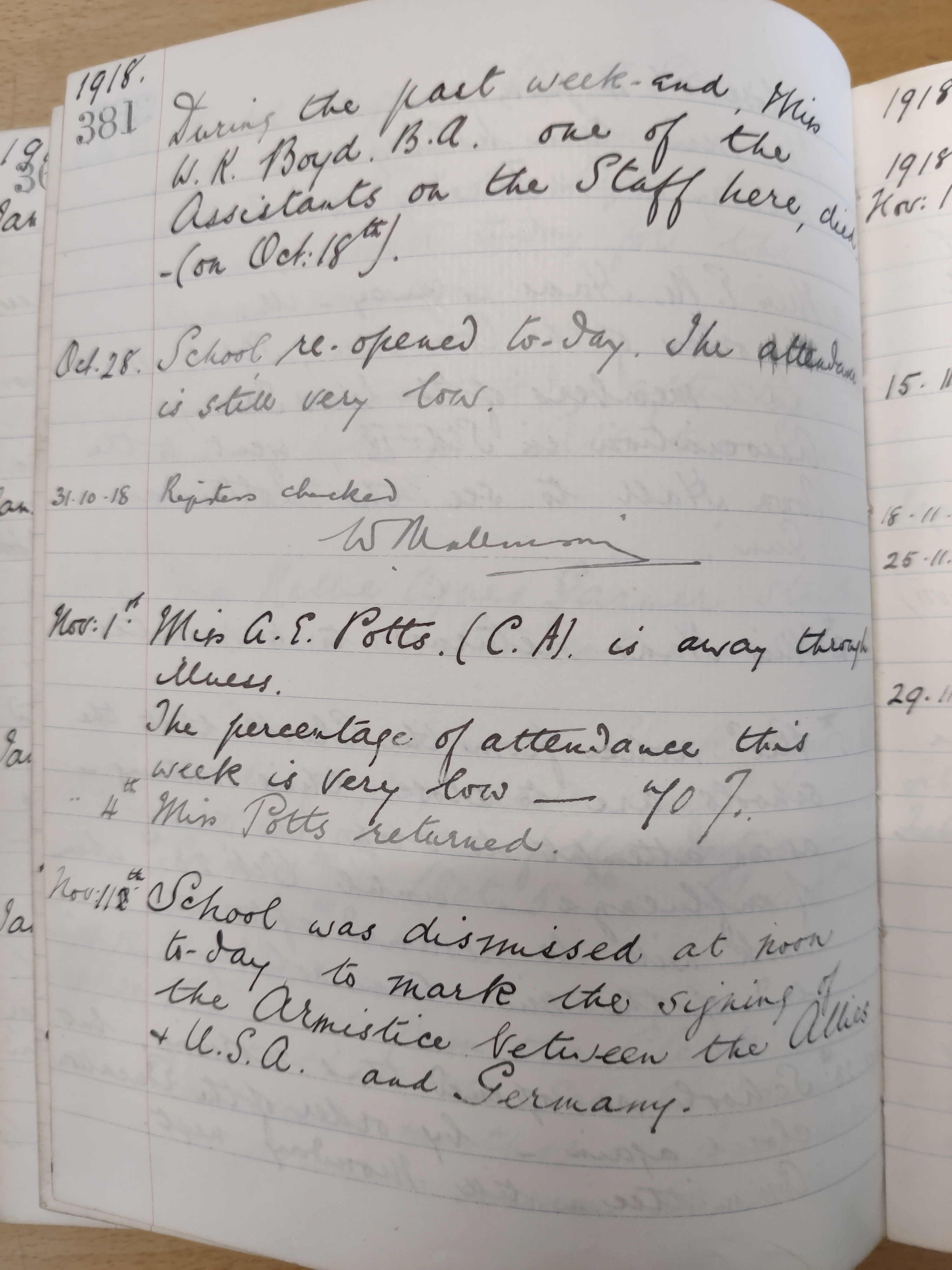 | Nov 11th | School was dismissed at noon to-day to mark the signing of the Armistice between the Allies & U.S.A. and Germany. |
