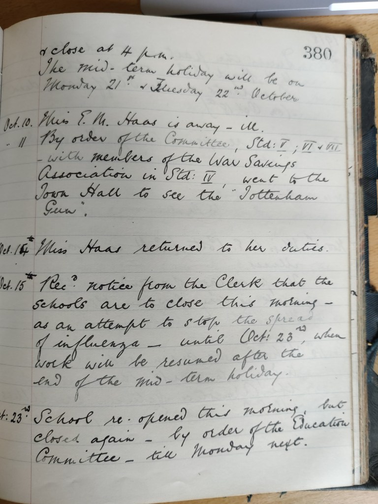 | Oct 10th 11th | Miss E.M. Haas is away – ill By order of the Committee, Std V; VI & VII -with members of the War Savings Association Std IV, went to the Town Hall to see the Tottenham Gun” |