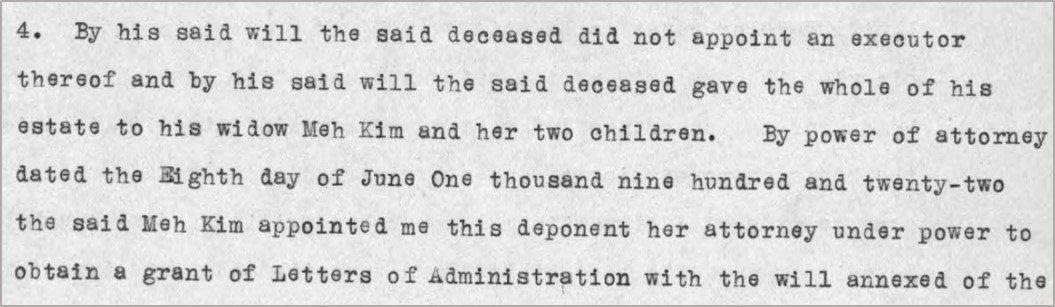 There is no known registration of marriage. In his will, John James leaves everything he possess to Meh Kim [such documents help to confirm relationships].