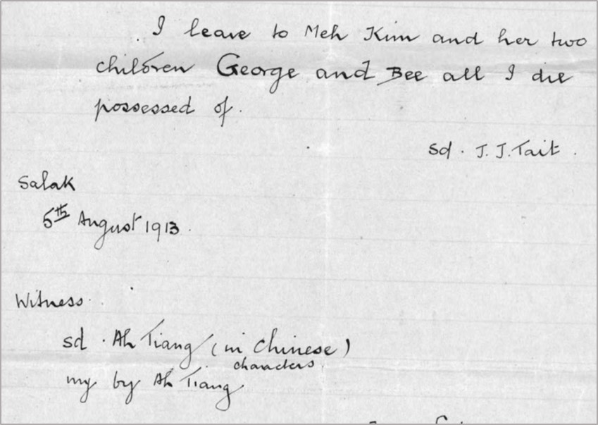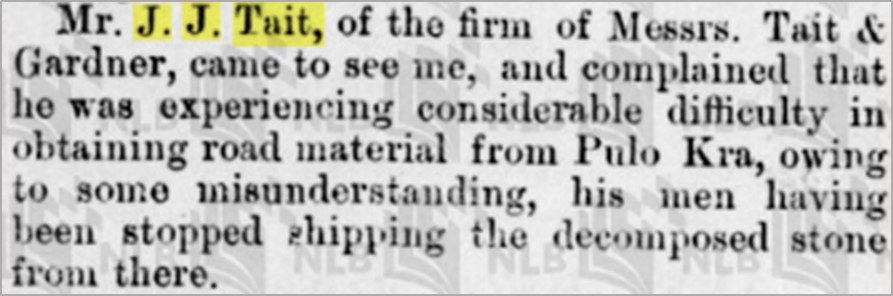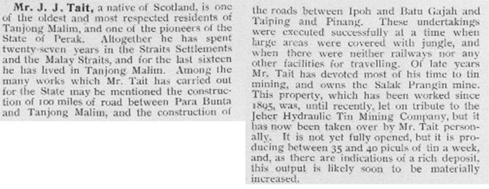The Malaysian Archives has some 120 documents referenced “Tait”. e.g., “Contract With Messrs. Tate & Tait For Three Miles Extension Of The Pahang Road”. Mostly viewable at the Archive, a few digitised.