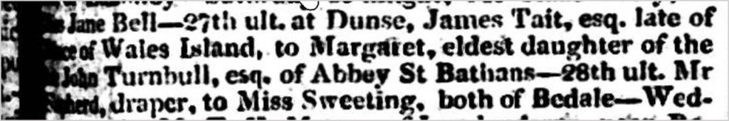 Newspaper “..27th ult. At Dunse, James Tait esq. late of Prince of Wales Island, to Margaret, eldest daughter of the John Turnbull, esq. of Abbey St Bathan.” Confirming James Tait worked in Penang.