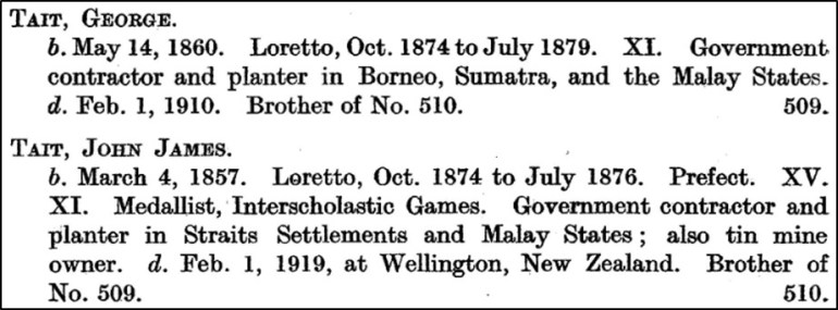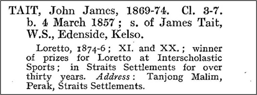 Interestingly the Tate in this business venture was Walter Howard Tate who was actually related by marriage. Walter’s wife was Ellen Florence Cumming, her brother Charles Ernest Cumming married Kim Sinn Khaw whose sister Kim Hoay Kham married George Tait, John James’ eldest son.