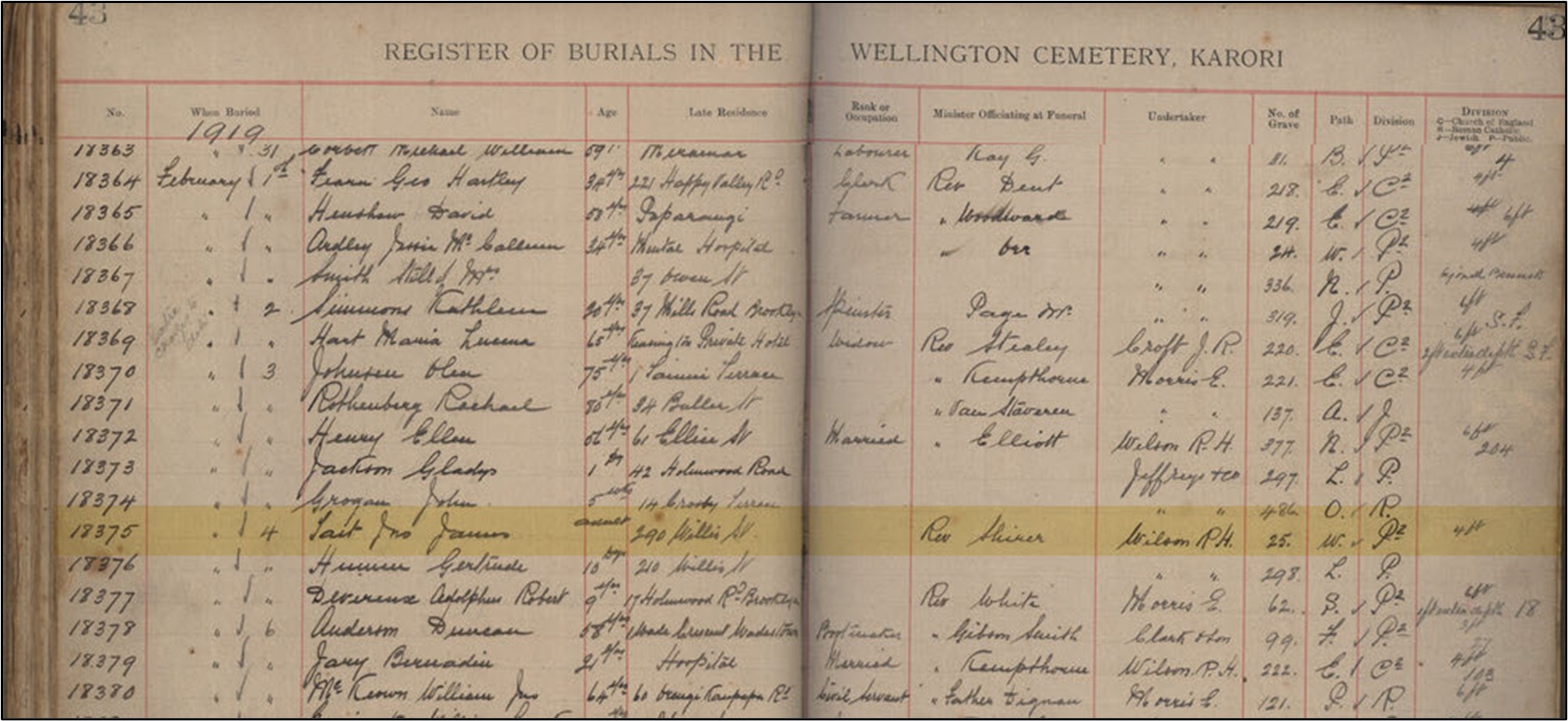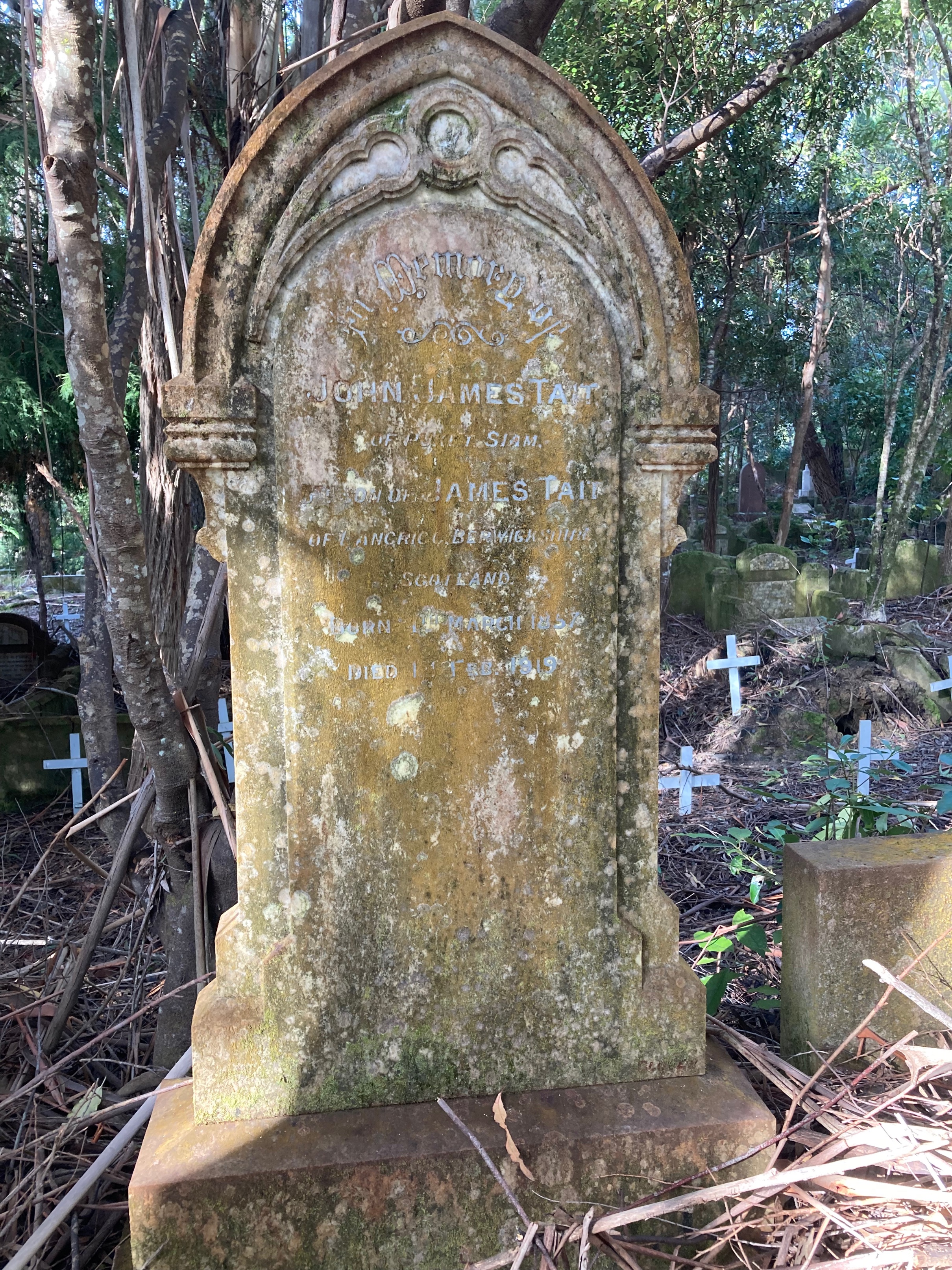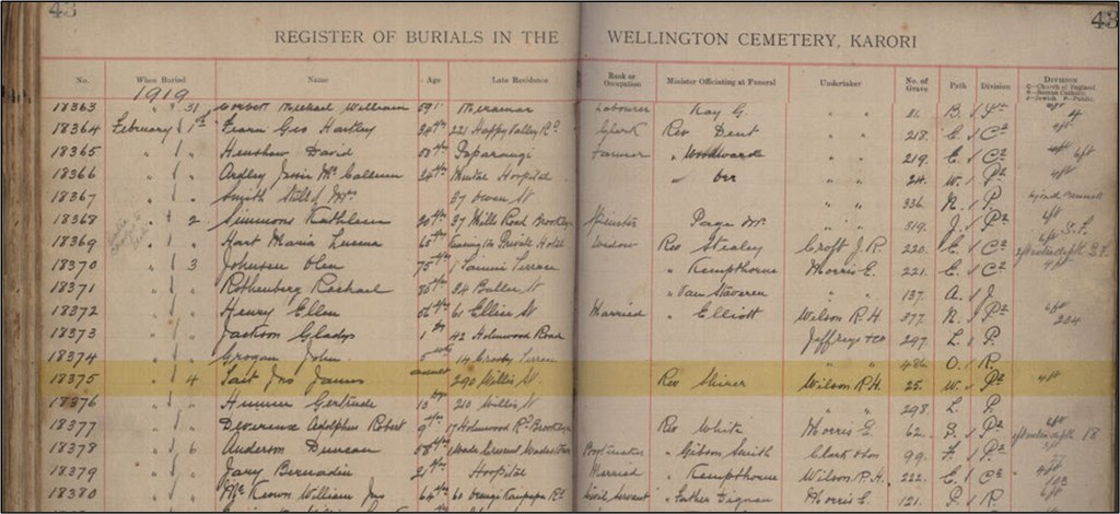 John James was buried on 4th February 1919 at Karori Cemetery. The burial was arranged by William “Kellie” Smith (of Kellies Castle fame https://tourismperakmalaysia.com/preview/our-destination/kellies-castle/) who was travelling with him as they were working together on a tin mining project.