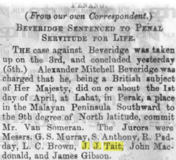 In 1884 John James is on the jury for a murder trial.” The jurors were Messrs. …J.J. Tait.”