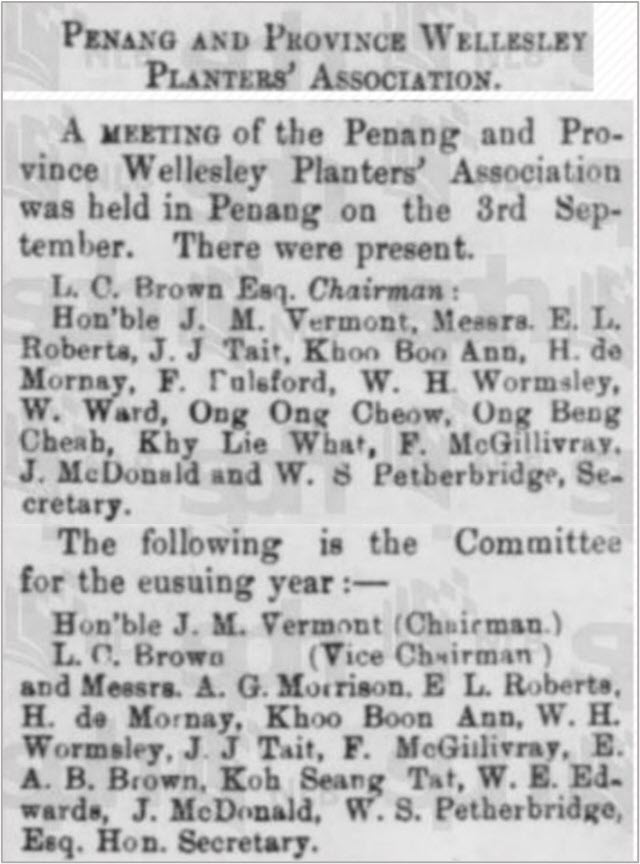 Newspapers were the social media of the time, recording events in our ancestors’ lives. In 1885 John James is reported being present at the meeting of the “Penang and Province Wellesley Planters Association”.