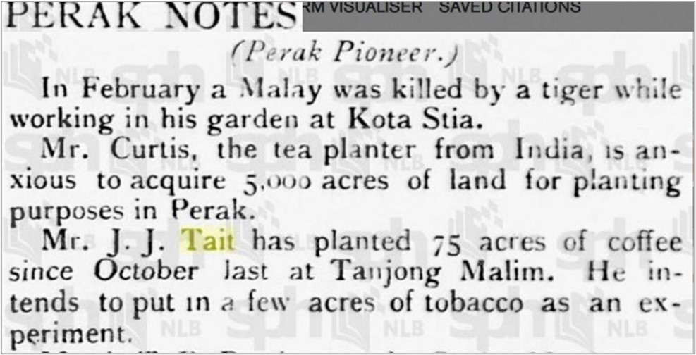 In 1897 John James is “planting 75 acres of coffee in Tanjong Malim and intends to put in few acres of tobacco as an experiment.”
