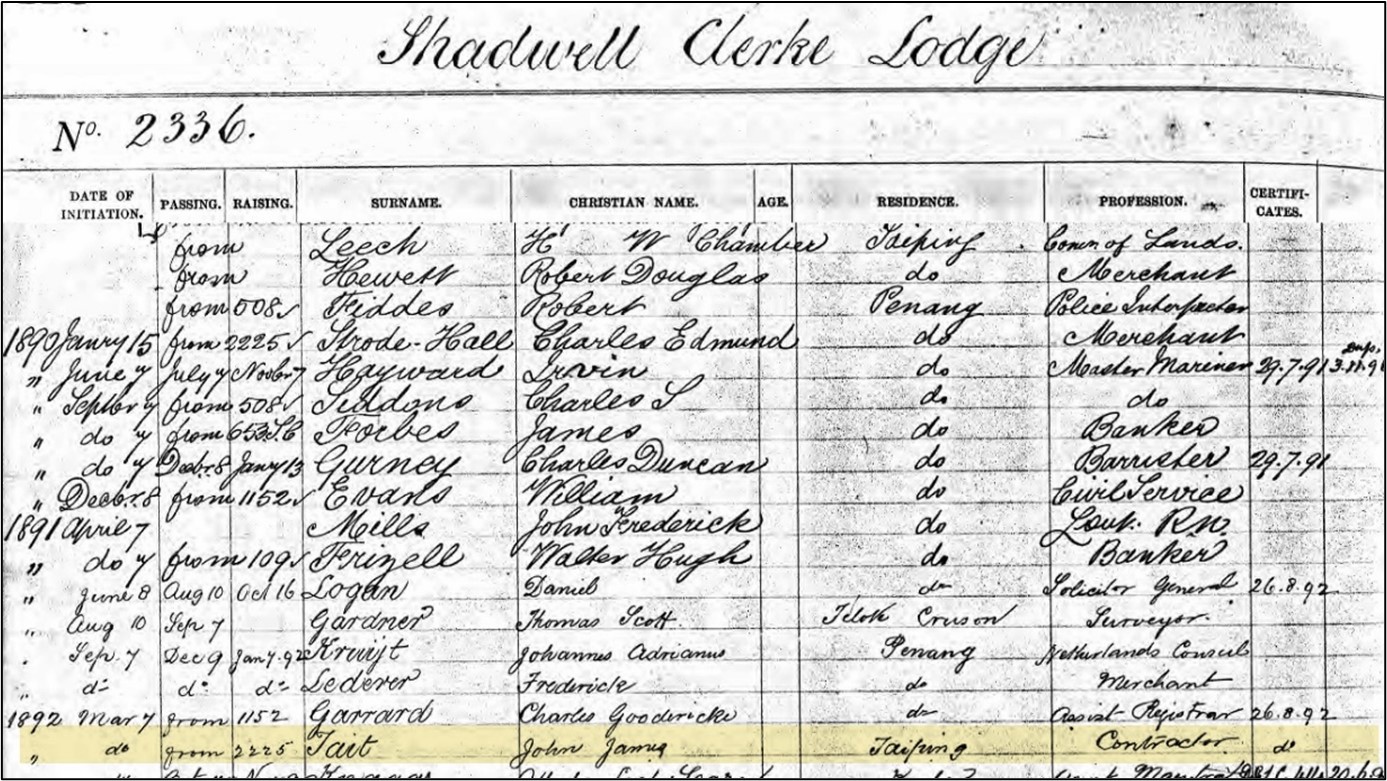 John James was also a member of the Shadwell Clerke Lodge of the Freemasons in Penang.