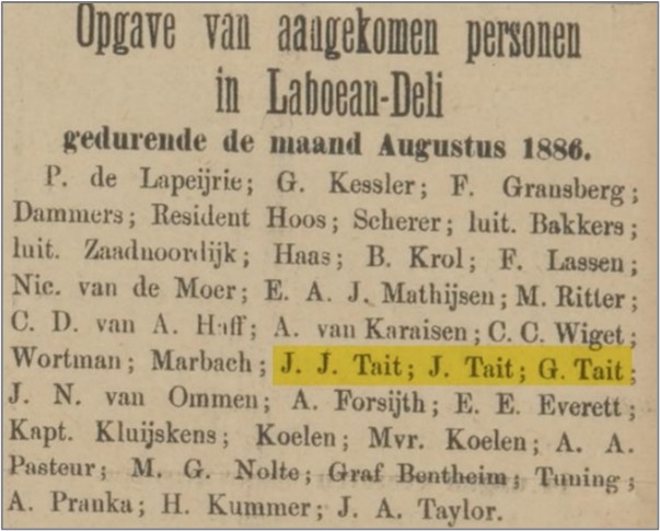 In The Dutch “Deli Current” we see that John James travels around for work, often with his two brothers. reports the arrival in 1886 at Laboean- Deli of J J Tait, J Tait and G. Tait.