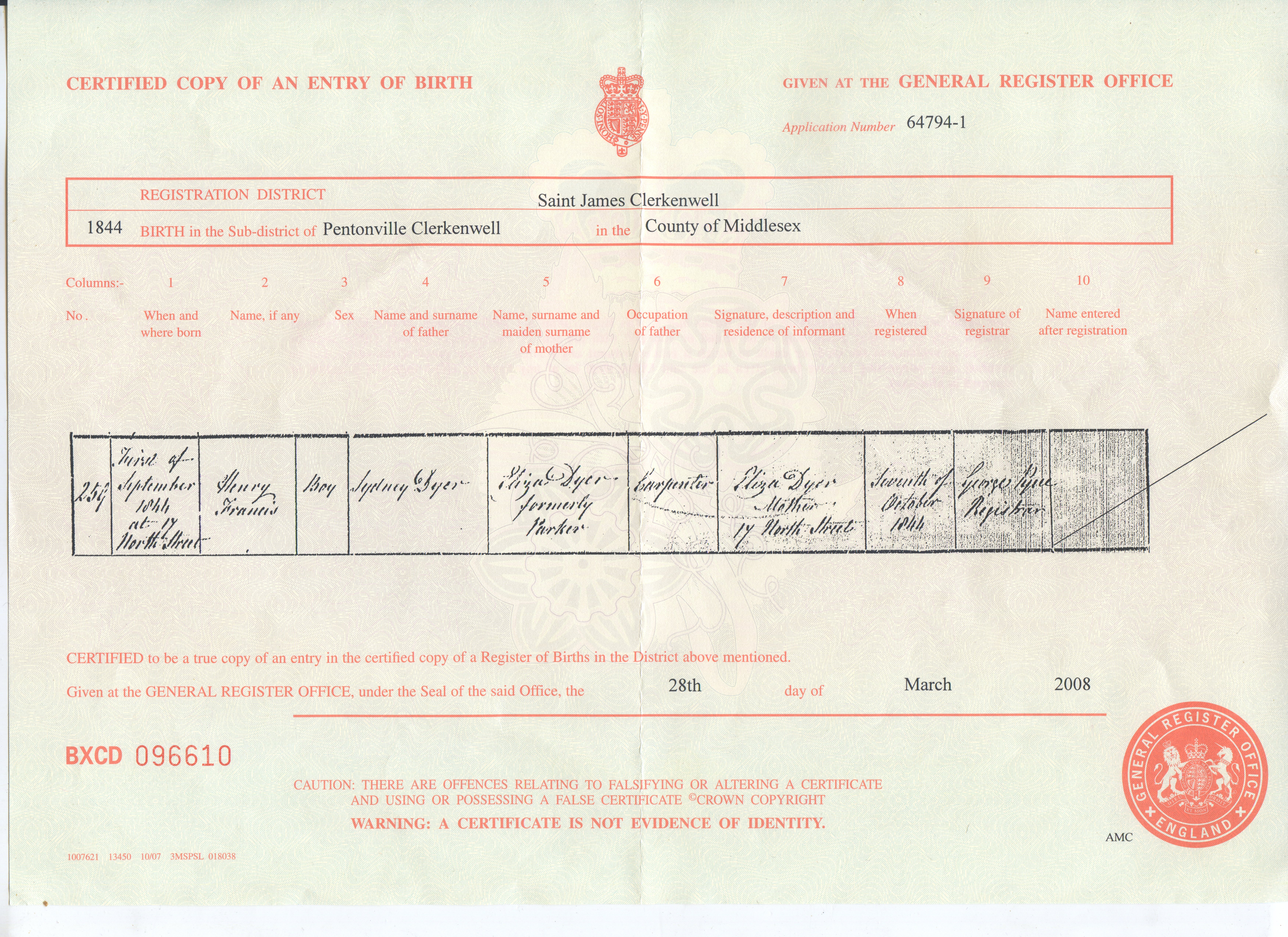 - Sydney Meredith Dyer (1879–1928). Born on 26 October 1879 in Islington. He carried his mother’s maiden name, Meredith, as his middle name. He passed away on 16 November 1928 in Palmers Green, Middlesex, at the age of 49 (my great grandfather).