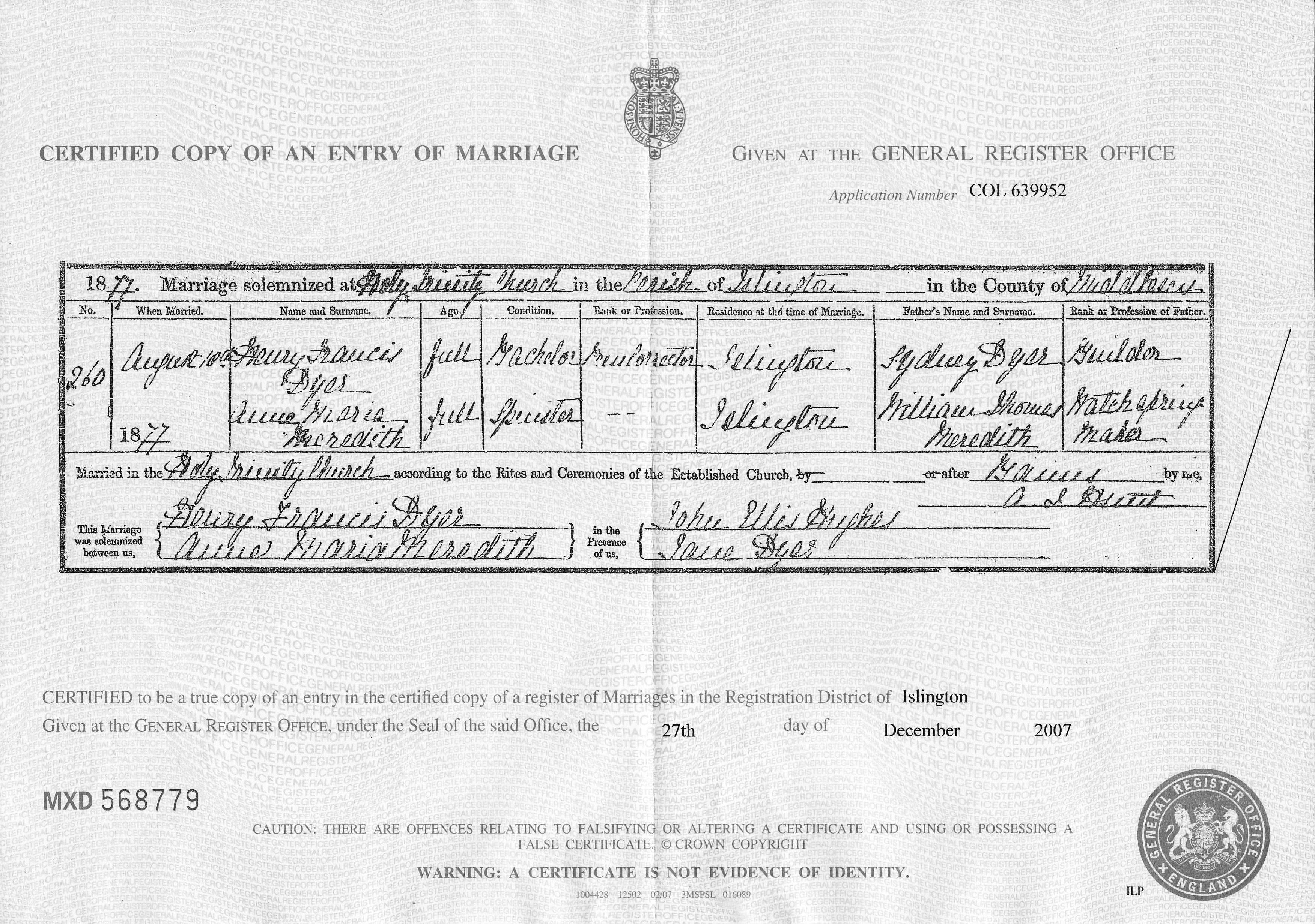 - Henry Francis Dyer (1878–1883) Born on 10 July 1878 in St Lukes, London, He was the eldest child, named after his father. Tragically, he died at just five years old on 28 May 1883 in Islington of Pneumonia and Diphtheritic paralysis. He was buried at Highgate Cemetery with his Meredith (maternal) grandparents and family.