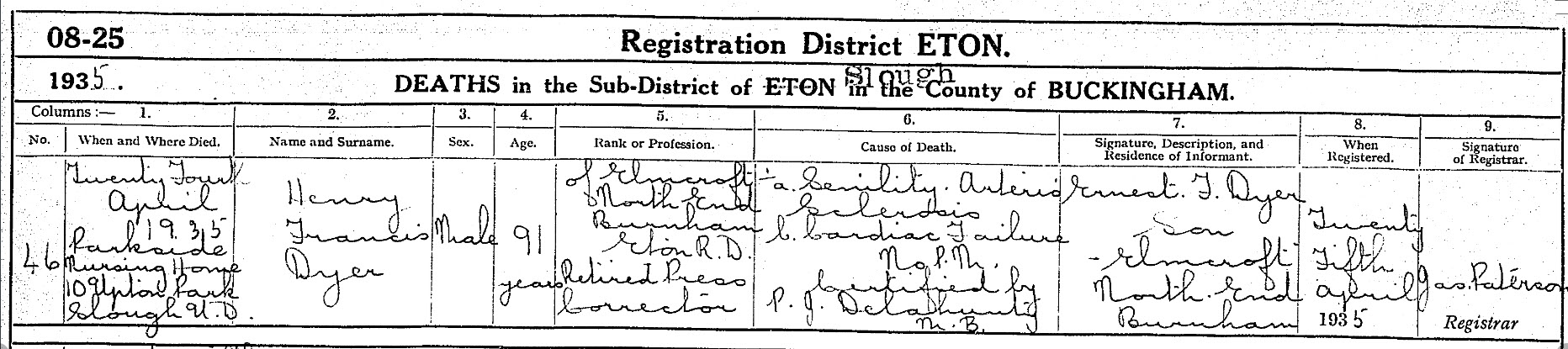 Henry lived to the remarkable age of 90, witnessing the transition from the horse-drawn Victorian era to the age of the motorcar and cinema. He passed away on 24th April 1935 in Slough, Buckinghamshire, from cardiac failure and arteriosclerosis.
