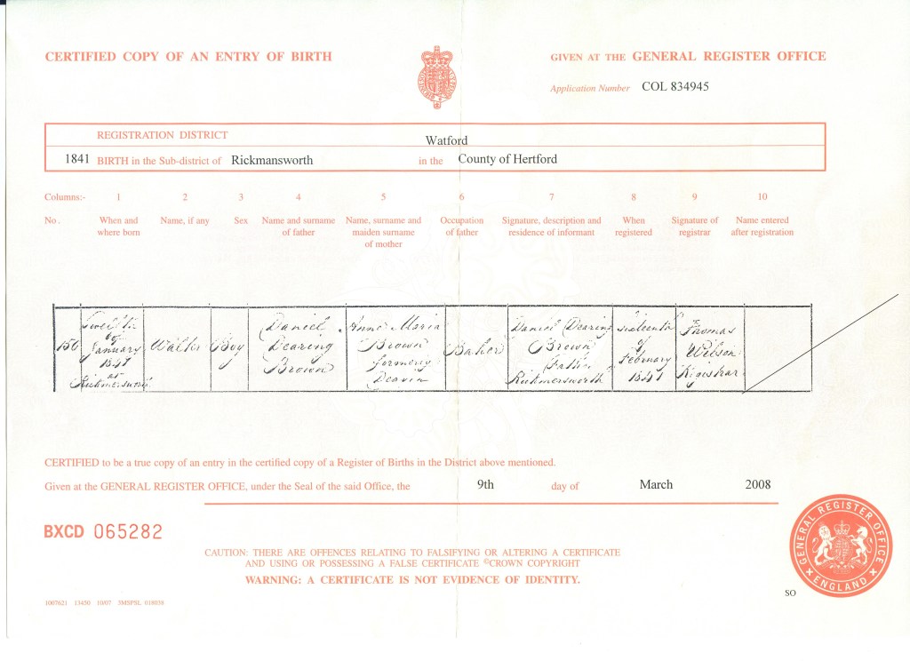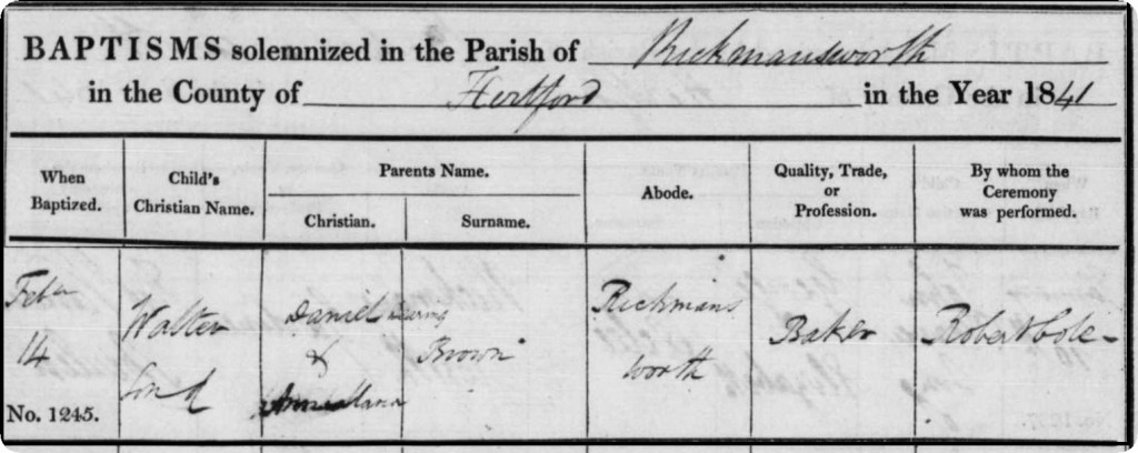 Walter Brown’s story begins in Rickmansworth, Hertfordshire, where he was born on 12th January 1841. He was the son of Daniel Dearing Brown and Anne Maria Odell Deavin. He was baptised just a month later on Valentines day (14th February). Walter spent his early years in the Hertfordshire countryside, probably living at the family baker’s shop. with his parents and siblings, though his teenage years were soon marked by the loss of his mother, Anne, who passed away around 1856 when Walter was only fifteen.