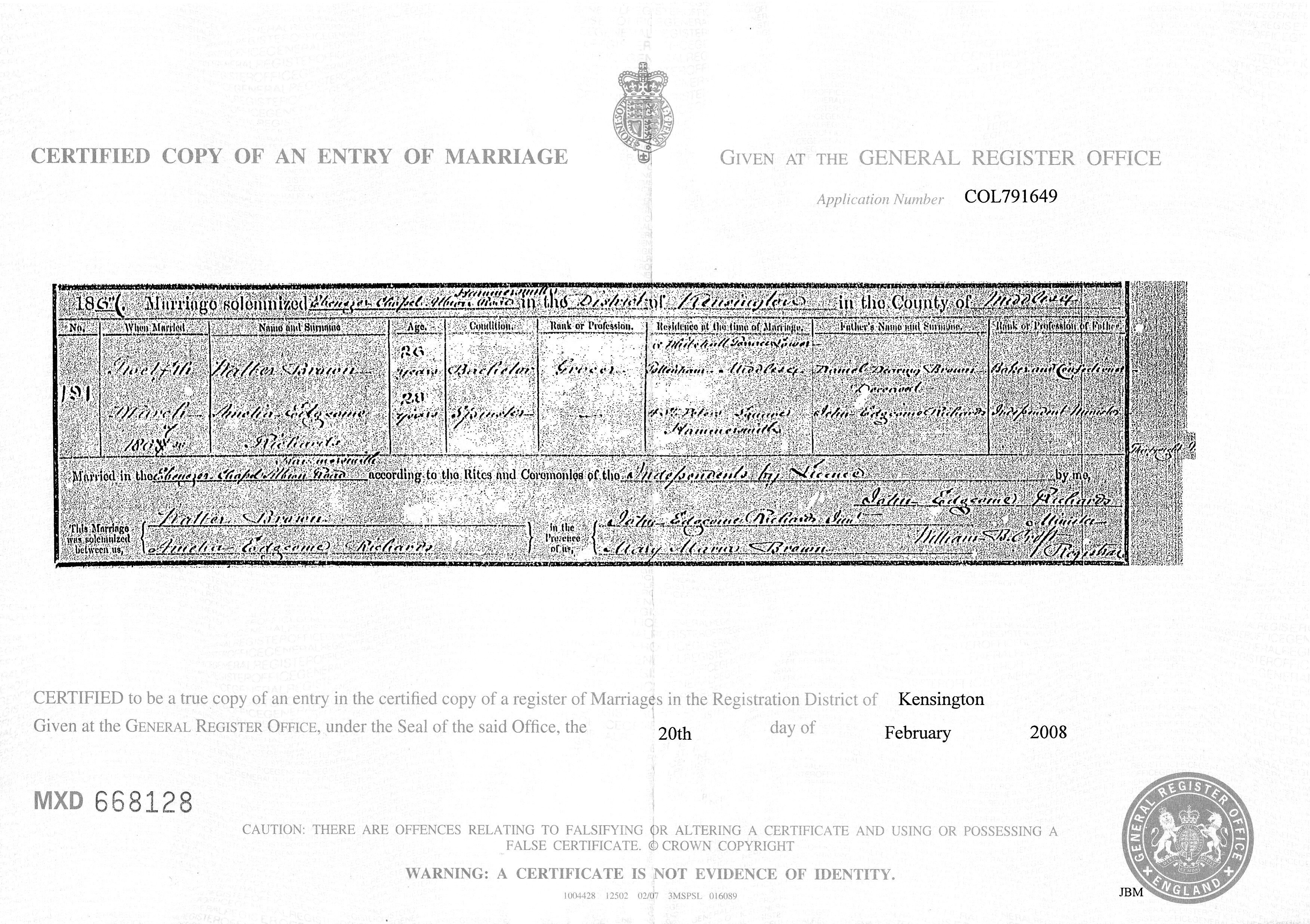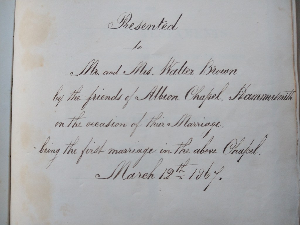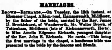 In 1867, at the age of 26, Walter married Amelia Edgcome Richards. Their wedding took place on 12th March at the Ebenezer Chapel in Hammersmith, the officiating minister was Amelia’s father Rev. John Edgcome Richards and it was the first marriage in the new chapel. The couple were presented with a Bible on the occasion (which I now own). The couple settled in Tottenham, initially living at 6 Whitehall Terrace on the corner of 741 the High Road, where Walter would run his business and raise a large family.