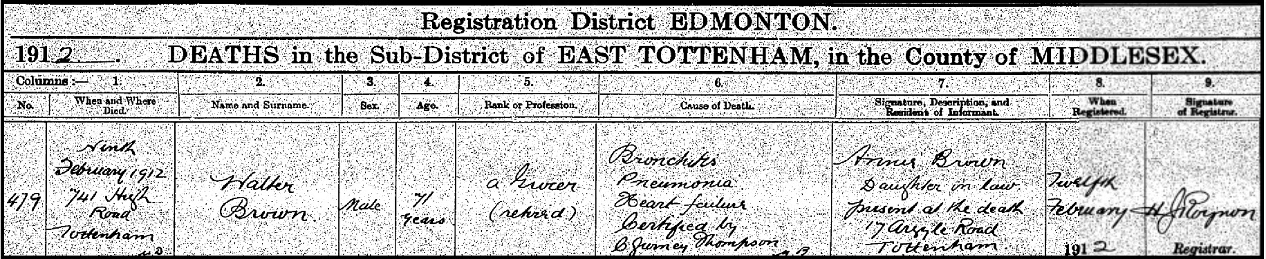 Walter lost his wife, Amelia, in 1897. He remained at the High Road property as a widower, continuing to work well into his seventies. Walter passed away at home on 9th February 1912 at the age of 71. The cause of death was recorded as bronchitis, pneumonia, and heart failure. He was buried in Tottenham Cemetery, leaving behind a legacy of a long-standing family business which his son ran at least till WW2.